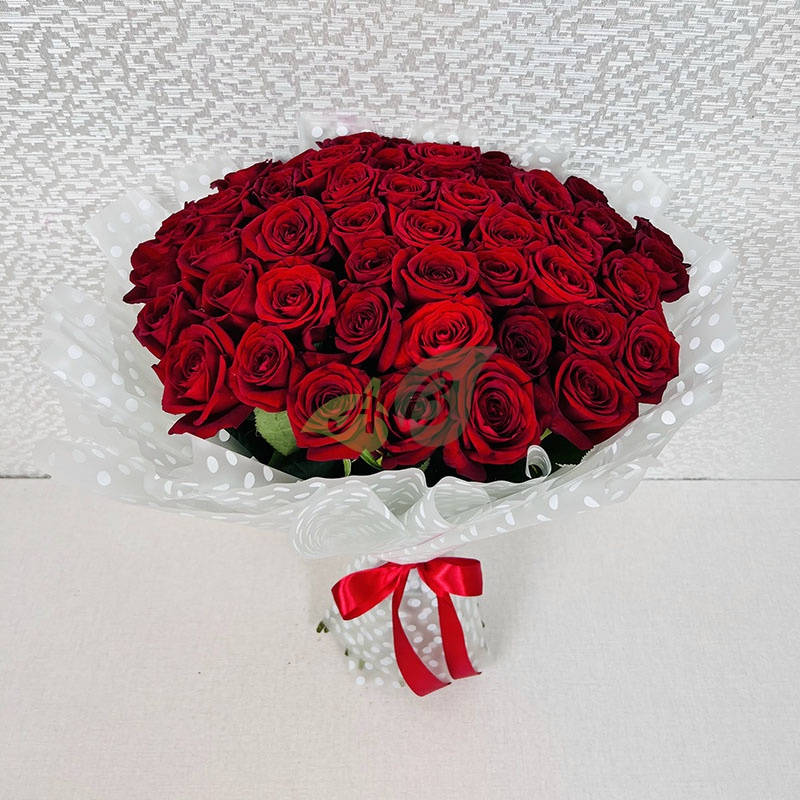 • Роза - 51 штука, цвет - красный, длина стебля - 40 см;