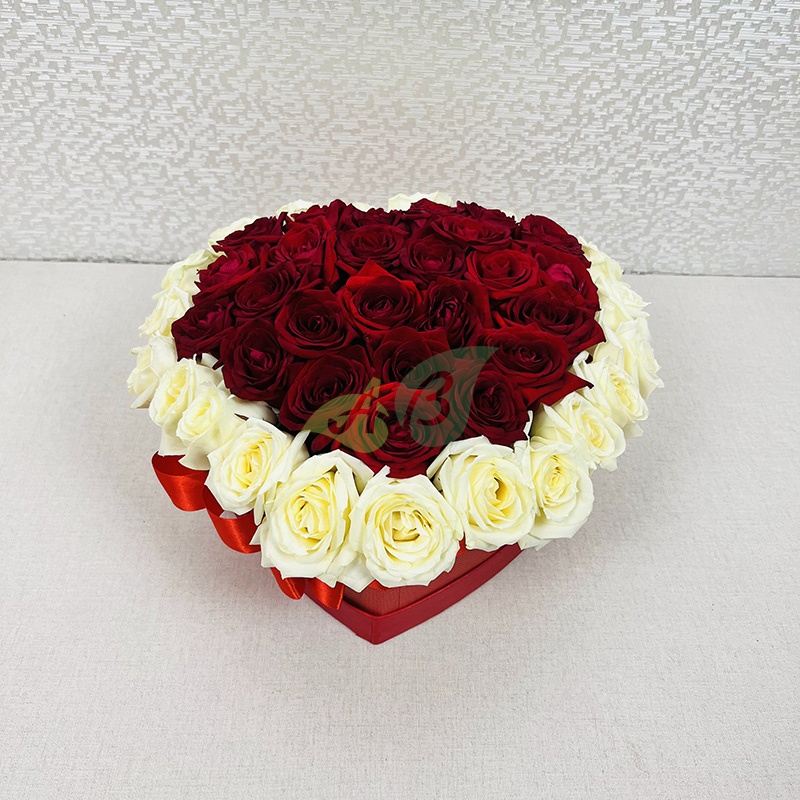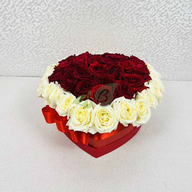 Если дарить цветы в коробке на праздник, то, несомненно, заказывать розы. Доставка этой шикарной композиции из красных и белых роз будет бесплатной по Холмску.
